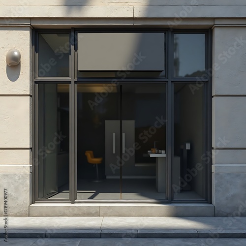 Fototapeta premium Modern Office Entrance with Large Glass Windows and Sliding Door in...