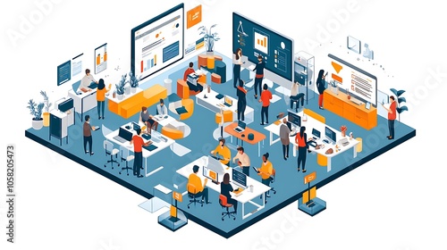 Obraz premium Modern Office Illustration - People Working on Computers and Collaborative Projects