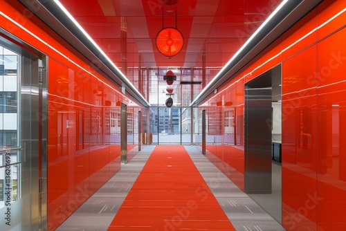 Obraz premium Modern Office Interior Design With Red Corridor, Glass Walls, and Contemporary Ceiling Lights