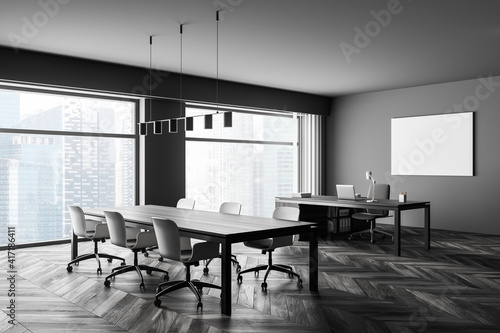 Fototapeta premium Modern office interior. Poster on wall mock up. Conference table. CEO desk. City view, panoramic window.