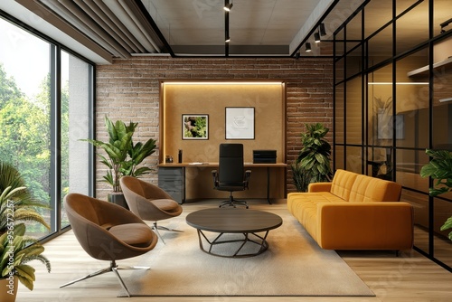 Fototapeta premium Modern office interior with a cozy seating area and greenery.