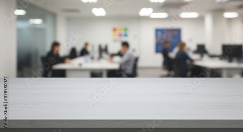 © Dostain, Fototapeta premium Modern Office Interior with a Glass-Top Table and Blurred Background of Working Professionals