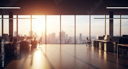 Obraz premium Modern Office Interior with City Skyline View at Sunset