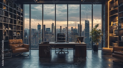 © Tuachan, Fototapeta premium Modern Office Interior with City View at Sunset in Urban Setting