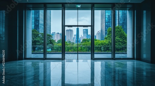 © yusufadi, Fototapeta premium Modern Office Interior with Cityscape View
