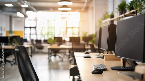 Fototapeta premium Modern Office Interior with Computer Desks and Natural Light