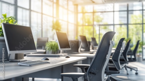 Fototapeta premium Modern office interior with computers and plants, designed for productivity...