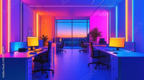 Fototapeta premium Modern office interior with desks and computers, creative workspace layout, bold minimalism, startup growth, business startup concept