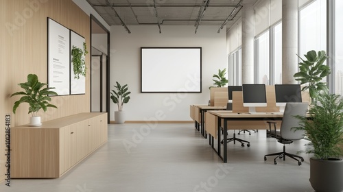 © Phirakhup, Fototapeta premium Modern office interior with desks, computers, and plants, bright and spacious.