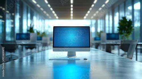 © TOTO, Naklejka premium Modern office interior with empty desks and large computer monitors