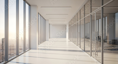 Obraz premium Modern Office Interior with Glass Walls and City View