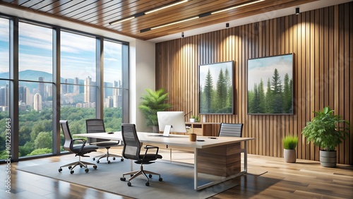 © Aiwonders, Fototapeta premium Modern Office Interior with Large Framed Poster on Wooden Wall, Expansive Windows, and Desks