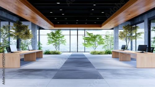 Obraz premium Modern office interior with large windows showcasing a tranquil outdoor view....
