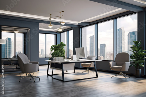Fototapeta premium Modern office interior with panoramic window and city view