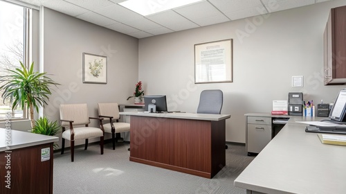 Fototapeta premium Modern Office Interior With Wooden Desk And Chairs