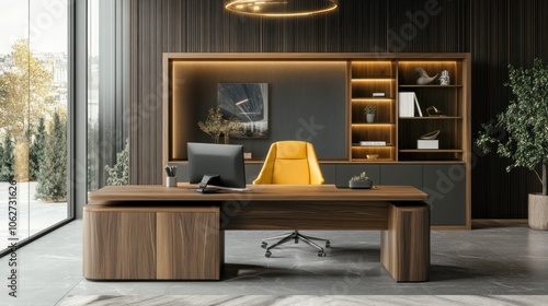 Fototapeta premium Modern office interior with wooden desk, yellow chair and large windows.