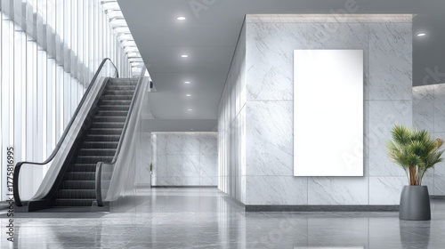 Obraz premium Modern Office Lobby with Escalator and Blank Poster Mockup for Advertising Display