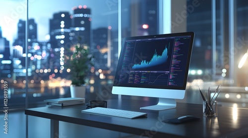 © irawan, Fototapeta premium Modern Office Night Cityscape Stock Trading Computer
