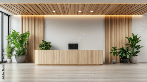 Fototapeta premium Modern office reception area with wooden accents and plants, creating welcoming atmosphere