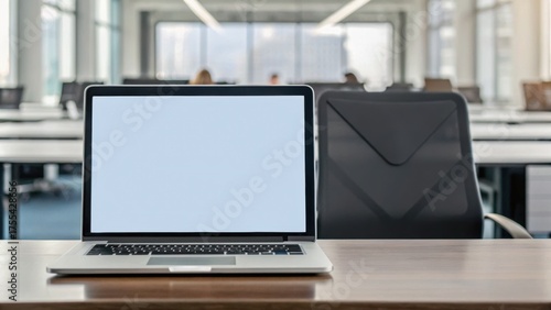 © thanawat, Fototapeta premium Modern office setting featuring a laptop and a chair, ready for work in a bright environment.