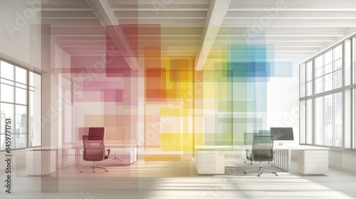 Fototapeta premium Modern Office Space with Vibrant Rainbow Hues and Transparent Geometric Overlays