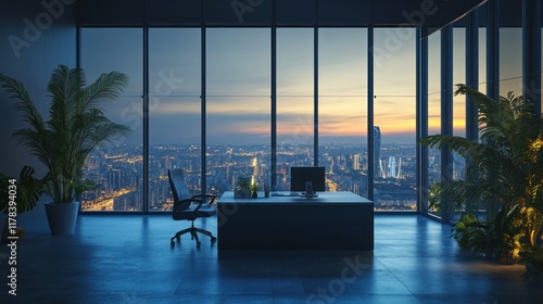 © Alfath, Fototapeta premium Modern office with city view at sunset.