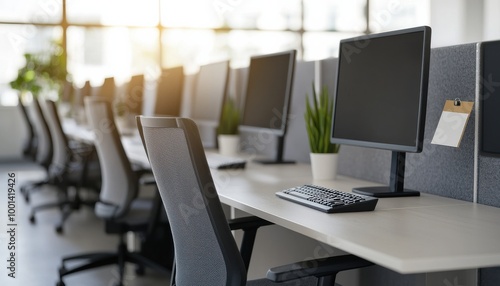 Fototapeta premium Modern office workspace with computers and plants, bright and organized...