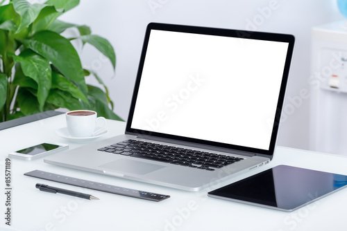 Fototapeta premium Modern office workspace with laptop computer, tablet pc and smartphone