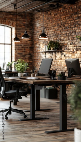 Naklejka premium Modern Office Workspace with Stylish Decor and Natural Lighting