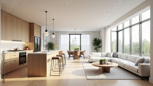 Fototapeta premium Modern open-concept living space with kitchen, dining, and living areas,...