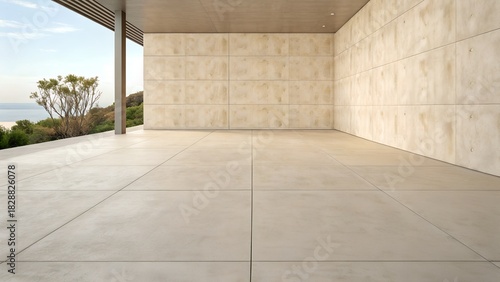 © MIkrom, Naklejka premium Modern Open Concept Living Space With Ocean View Neutral Tones And Concrete Walls