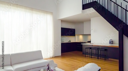 Fototapeta premium Modern, open-plan living area with a visible kitchen and stairs.