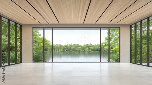 © Nadiyah, Obraz premium Modern open-plan room with lake view, spacious interior