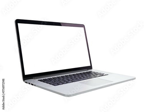 © risky, Fototapeta premium Modern open portable computer on a black backdrop, screen clear for text or graphics