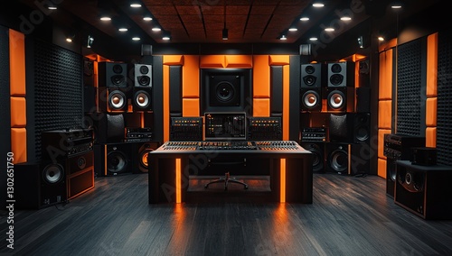 Fototapeta premium Modern Orange And Black Professional Music Recording Studio Interior