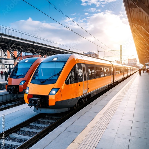 © Reno, Naklejka premium Modern orange trains at a station in daylight