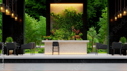 © BOJOShop, Fototapeta premium Modern Outdoor Cafe Design Minimalist Bar Green Wall Lush Garden