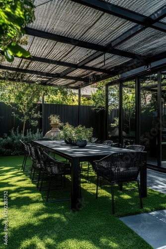 Naklejka premium Modern outdoor dining area featuring black table and chairs surrounded by...