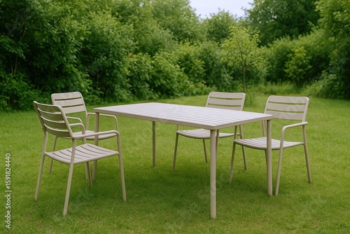 Fototapeta premium Modern outdoor dining set with four chairs and table on lush green grass in garden.