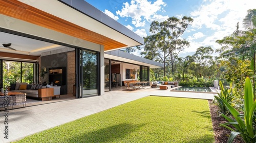 Naklejka premium Modern Outdoor Living Space with Pool and Lush Greenery Surroundings