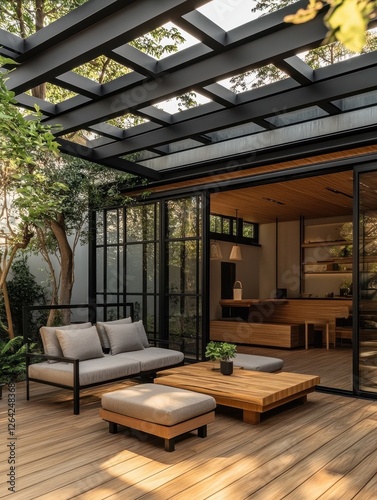 Naklejka premium Modern outdoor patio seating area with pergola and sunlight