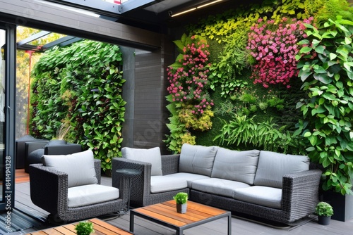 Obraz premium Modern Outdoor Patio with Vertical Garden Wall and Rattan Furniture