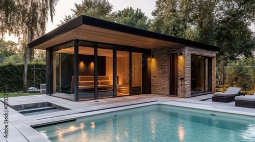 Fototapeta premium Modern outdoor sauna with a swimming pool