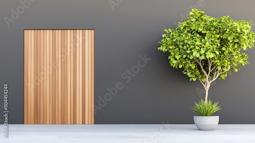 © Elysian Essence, Fototapeta premium Modern outdoor wall with wooden door and green tree, stylish architectural background, minimalistic design, clean and natural aesthetic, space for text, elegant exterior
