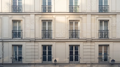© D, Fototapeta premium Modern Parisian building, minimalist facade, complete wall with windows and doors, sunny afternoon, peaceful atmosphere, no people around.