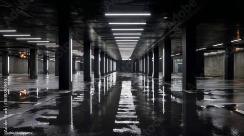 © Ilmi, Obraz premium Modern Parking Area with Sleek Black Pillars and Bright White LED Lights Reflecting on Wet Surfaces