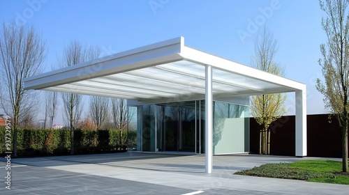 Obraz premium Modern parking shed with a polycarbonate roof in a clean white finish, copy space
