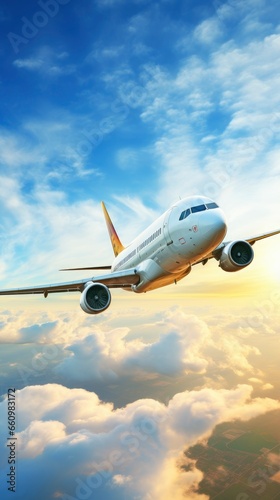 Obraz premium Modern passenger airplane flying in the fantastic beautiful bright sky