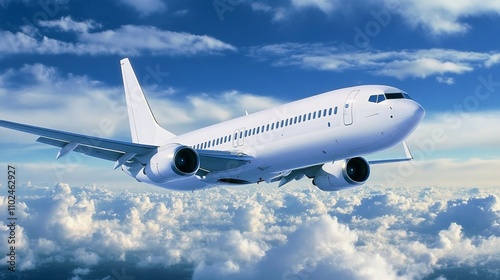 © Eva, Obraz premium Modern Passenger Airplane Soaring Through the Fluffy White Clouds Across the Azure Sky