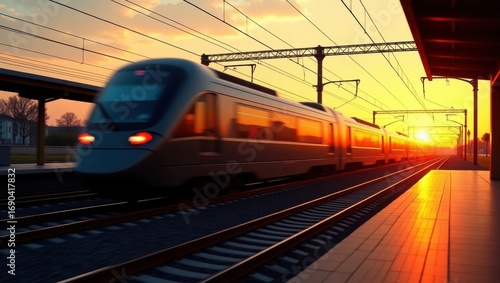 © Fatema, Fototapeta premium Modern passenger train arriving at station during golden hour sunset